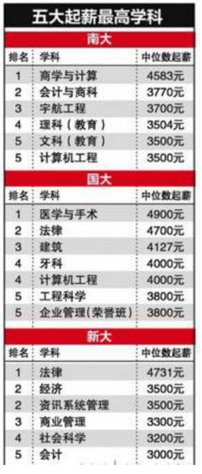 商学与计算、医学和法律是中位数起薪最高的学科。其中,国大医学院毕业生的起薪最高,中位数起薪达$4900元,其次为新大法学院和南大商学与计算系,中位数起薪分别为$4731元和$4583元