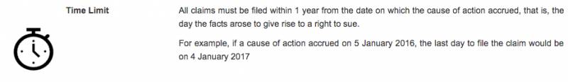 消费者须在事情发生1年之内向法庭提起诉讼。不过,法庭只受理与商品或服务销售和财产损失有关的纠纷,而无法处理以租用购买方式购得的缺陷物品(不分索偿的多寡)。