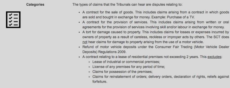– 对财产造成损害的侵权行为。这包括财产所有人因不小心、鲁莽或不当行为而招致的损失或费用索赔。小额法庭不受理因使用汽车而导致财产损失的索赔。