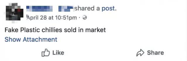 4月27日,本地一名网友在脸书上发文警告公众,说新加坡出现了假辣椒,还拍下了视频,展示自己从Tekka Market前面一家店买回来的辣椒究竟有什么问题。