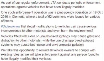 作为定期执行的一部分,LTA对非法改装的车辆进行定期检查。其中一项执法行动就是从2016年10月18日在金文泰进行的联合行动,共发出52张罚单。