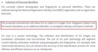 目前国民登记修正法案在国会进行一读;修正的主要内容,包括允许移民与关卡局,向新加坡公民和永久居民搜集眼睛虹膜的图像。