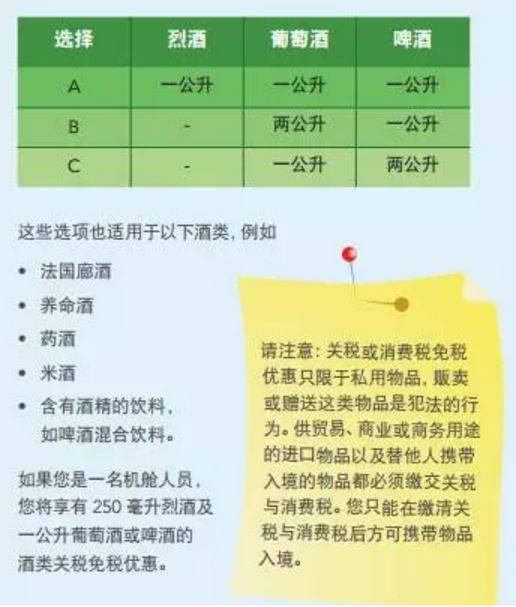 您将能享有以下其中任何一个酒类,免税优惠的组合:除此外,将要在海关申报上税才可入关。