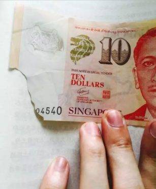 网友说这还是第一次在新加坡拿到破损纸币呢