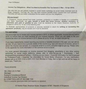 新加坡本地一些博客近日接获税务局的信函,要求他们在申报所得税时,包括那些通过他们的博客网站收到的产品或服务,令他们感到惊讶。据电台938LIVE的报道,信件注明所有非金钱利益,包括为赞助商评论产品后所得的产品或服务,都必须申报,也可能需要为此缴税