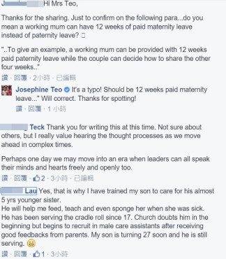 目前,妈妈的16周带薪产假中,丈夫只能同享其中的一周产假。杨莉明在文章中表示,政府正探讨让妈妈和丈夫共享更多有薪产假。