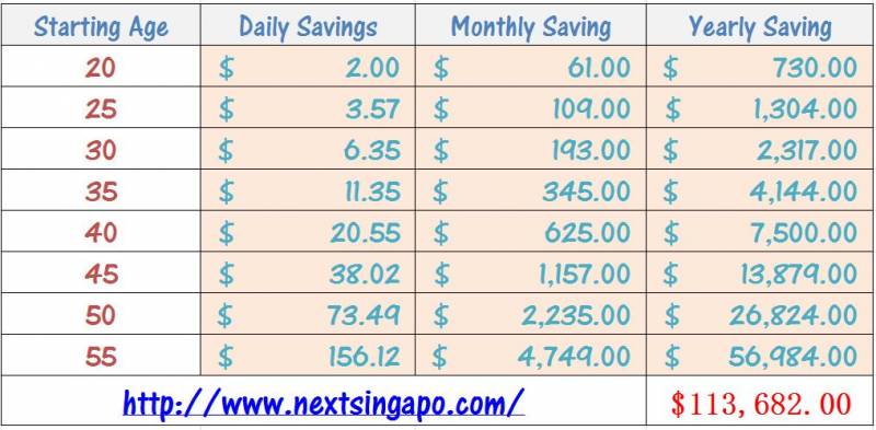 就让我们设在20岁开始,从大家来新加坡开始打一份工开始,每天从最低的$ 2开始,一个月不间断,你大概一个月能存个$ 61 ++左右,当然头两三年 最辛苦了,不是因为存钱的关西,而是因为头几年看到的数目真的太少了,所以自然而然很多人就会放弃,心理就会觉得没必要,还是算了好了!