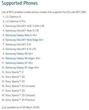 1. 首先你需要一部带有NFC功能的智能手机。不幸的是,并非所有NFC手机都能使用NFC ez-link。以下就是官方公布的支持NFC ez-link的手机型号: