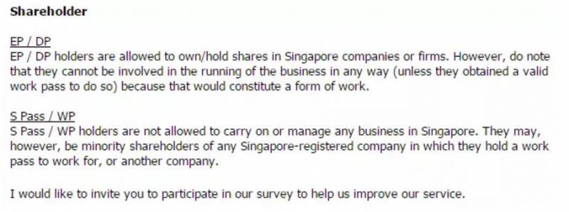 在新加坡注册公司,有一条明文规定:SP/WP不可以做公司股东。反过来也是一样,如果在一个外国人在一家公司做股东,那么再去申请SP/WP准证一般是不被批准的。但是最近有种说法,人力部这一政策已经悄悄解禁。对此,有网友专门邮件咨询了人力部,得到如下答复: