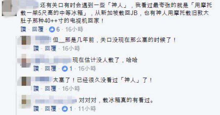 3、“还有关口有时会遇到一些“神人”,我看过最夸张的就是“用摩托载一架5尺高的中等冰箱”,从新加坡载回JB,也有神人用摩托载旧款大肚子那种40++寸的电视机回家! ”