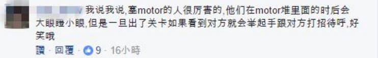 1 、“我说我说,塞motor的人很厉害的,他们在motor堆里面的时后会大眼瞪小眼,但是一旦出了关卡如果看到对方就会举起手跟对方打招呼,好笑哦”