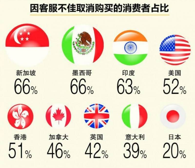 除了新加坡外,墨西哥人也相当挑剔,同样三分之二的人会因为服务差而决定不购买产品服务,其次是印度(63%)和美国(52%)。日本人则最能容忍差劲服务,只有20%的消费者会因为服务差而决定不购买。