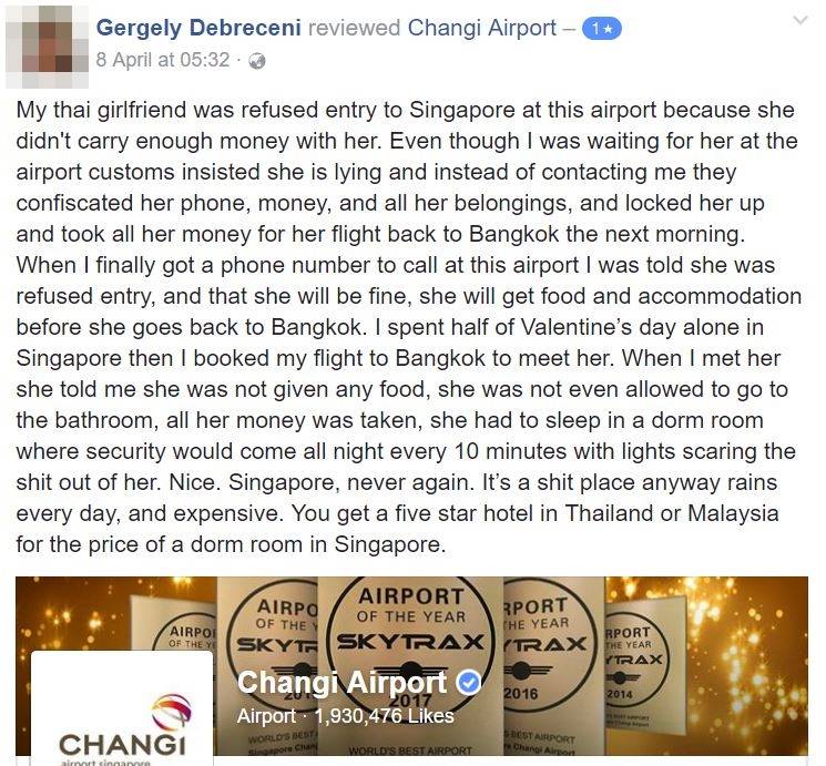 我的泰国女友被新加坡海关扣下了,因为入境没带足够的钱。尽管我就在机场外等她,但是他们坚持说我女友撒谎,也不联系我就直接扣人。他们没收了她的电话、钱和所有的东西还把她锁起来,订好隔天早上回曼谷的机票给她。