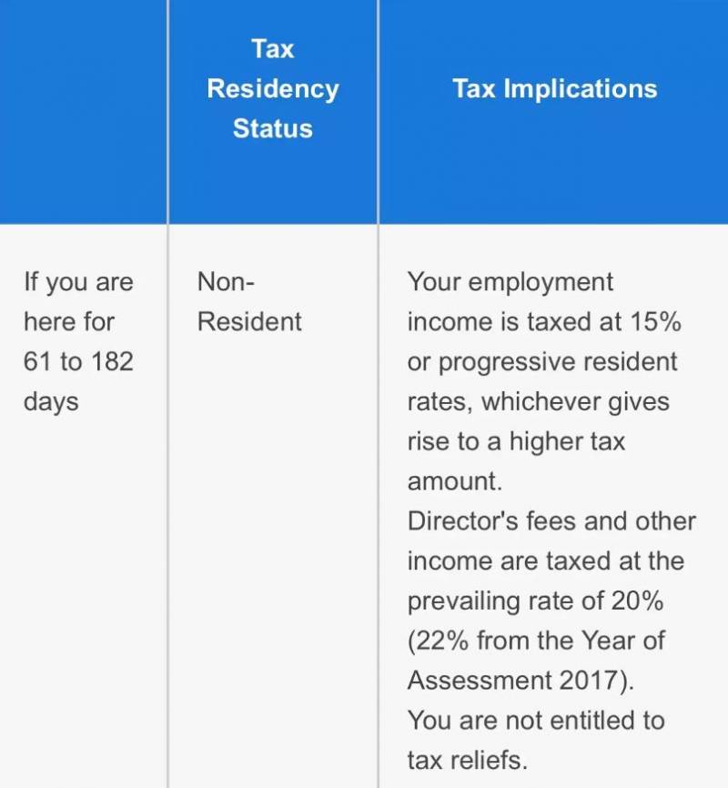 1)根据新加坡税务局规定,在新加坡工作超过61天却不满183天的外籍劳工,需要按照非居民的税收规定,15% ~ 22%不等去偿还个人所得税。通常雇员都是15%,从2017年开始,如果职位是公司的董事长并有其它方面的收入(比如公司盈利带来的股份分红,房产投资…..),个人所得税征收比例就为22%。