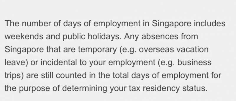2)183天指在新加坡就业的天数,包括周末和公共假日。就职期间合理的出境新加坡(如海外度假)或因工作安排的(如出差)仍然计算在总的就业时间里,以此来确定税务征收。
