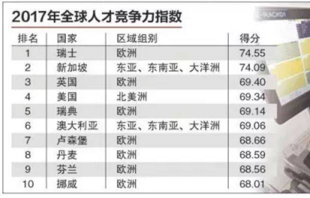 这项“全球人才竞争力指数”调查,由英士国际商学院(INSEAD)、新加坡人力资本领导能力研究院(HCLI)和人力资源公司德科集团(Adecco)携手展开。