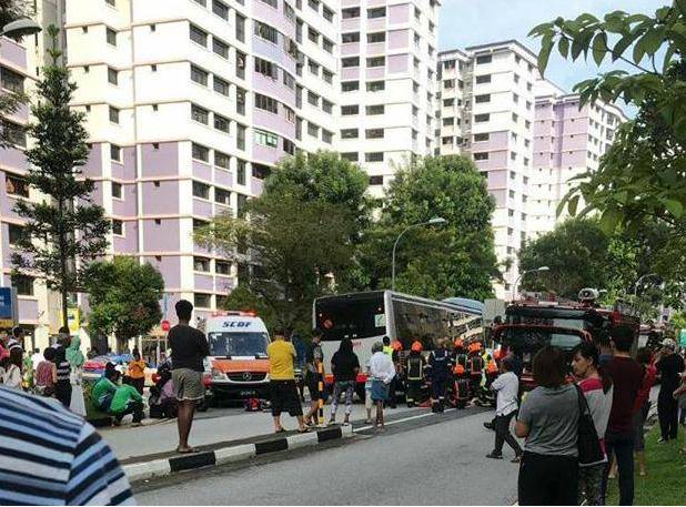 今天上午,在蔡厝港一带出现了严重车祸,一辆SMRT巴士把6岁男童撞倒后卷入车底,救护人员接到通报之后马上来到现场,使用起重设备将男子救出来。