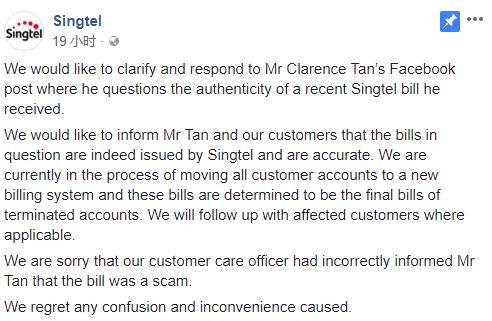 新电信也指出,他们的客户服务人员早前给Clarence Tan提供错误信息,误指账单是假的,公司对此表示道歉。