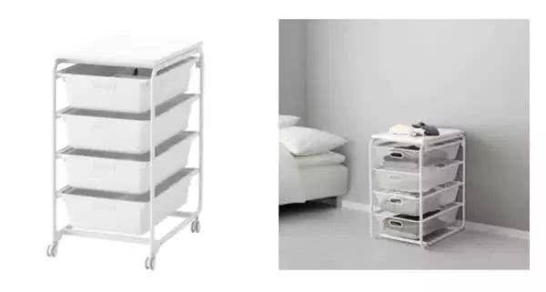 艾格特系列这款组合储物架,尺寸41cm*60cm*78cm,带滚轮,可方便移动进行场景切换。同时,选择了密封的储物筐,能有效防尘,最上面是搁架设计,可以随手放个物件。缺点在于不是透明,需要进行标签化管理。这款产品用在衣帽间,或者家有2岁以内小朋友日常换衣服,是趁手的选择。