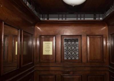 升降机内部的红木装潢让狭小的空间显得精致典雅,没有年久失修的痕迹。与普通升降机不同,这台升降机光按下按钮是不会驱动的,必须手动将外侧的铁闸门关上,才能开启。