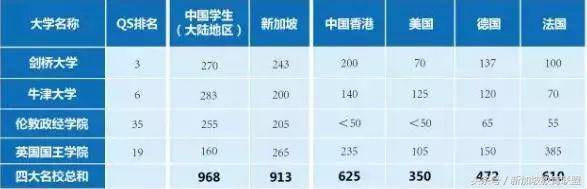表面看来,英国几大顶级名校在中国大陆录取的人数最多。但实际上,中国每年考生大约有900多万,美国高考人数大约是150万,新加坡大约只有1.5万,从比例来说,中国、美国、新加坡的考生人数比例是,600:100:1。按照这个比例上来讲,剑桥、牛津以及伦敦政经学院等名校,给中国考生的录取比例是非常小的。