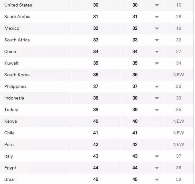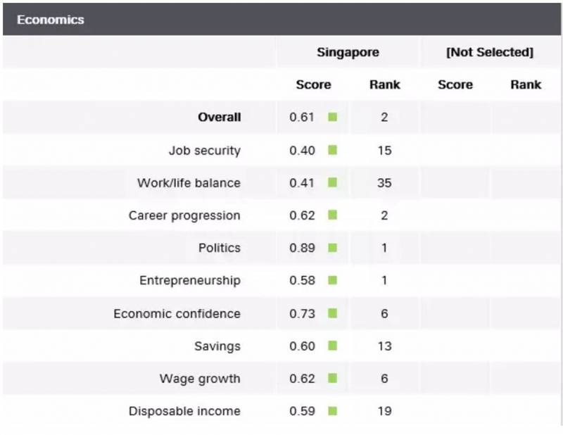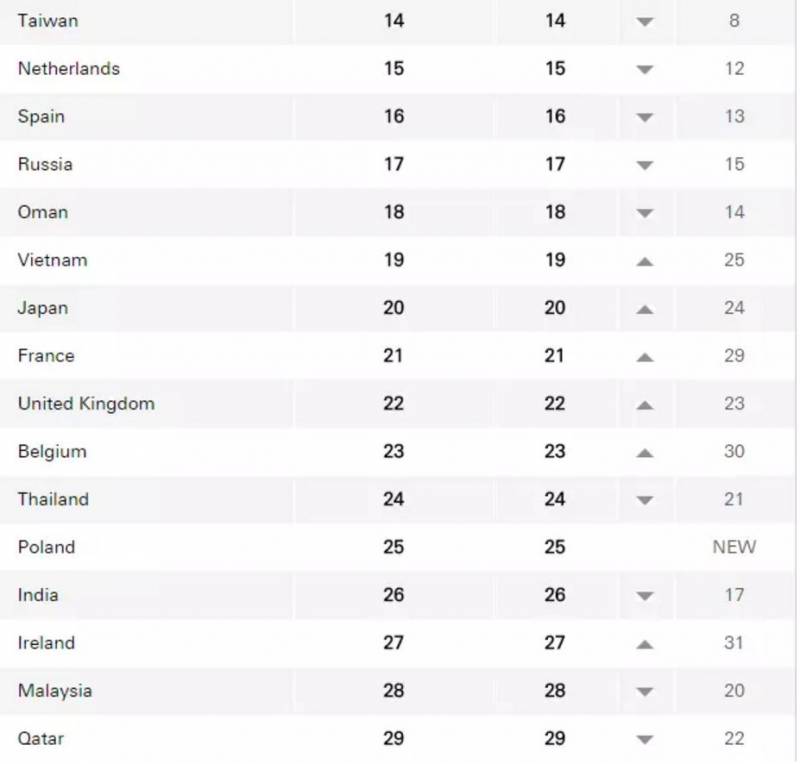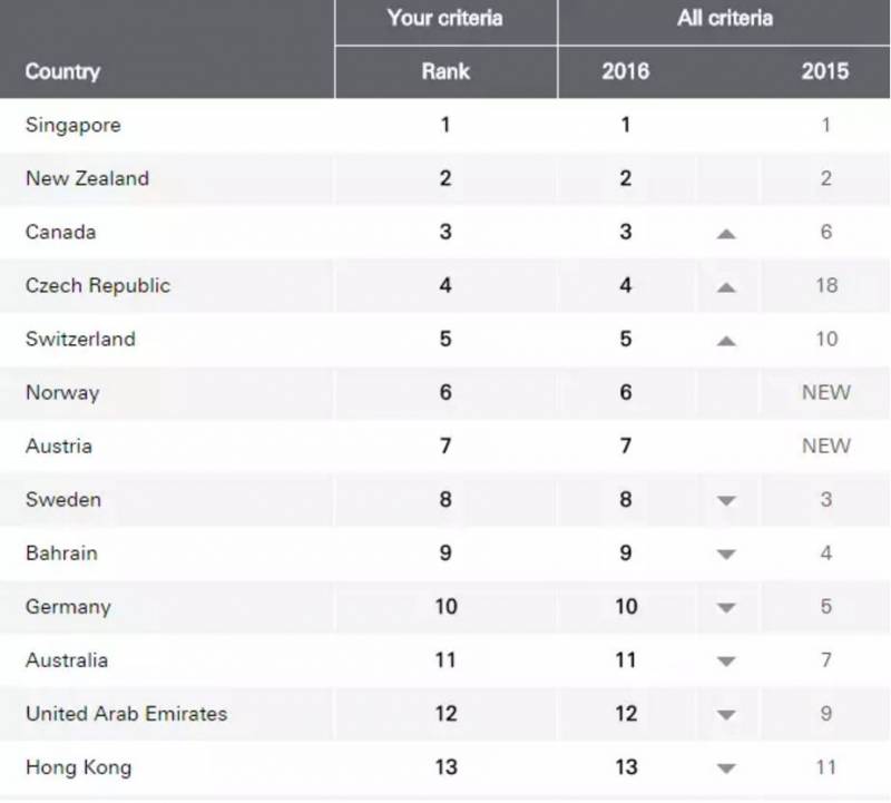 新加坡综合排名第一,新西兰、加拿大、捷克、瑞士、挪威等紧随其后。