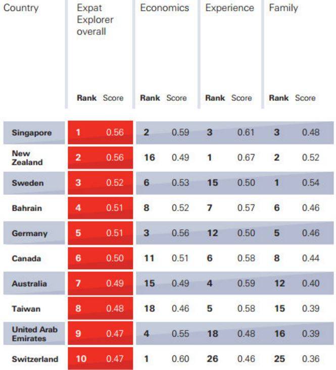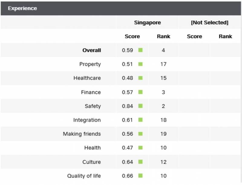 在生活体验(生活质量、融入难易度等)方面,新西兰排名第一,而西班牙排名第二,新加坡位居第三。