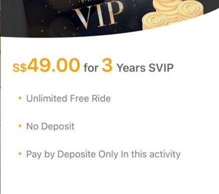 据说,在启动oBike应用程序时,荧幕立刻弹出视窗显示,用户可选择将49新元的定金转换为三年的贵宾会员(VIP)福利的促销。贵宾会员的福利包括无限制免费使用oBike,以及不需要缴交定金就能使用oBike服务。