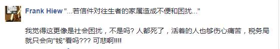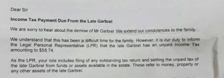 追税信的内容在简单表示哀悼后就切入主题:“我们为往生者的离世感到难过,并向家属诚挚地致哀。我们理解对家属而言,这是个艰难的时刻,不过我们有责任告诉往生者的法律代表,往生者依然欠下共58元7角4分的未缴税款。”