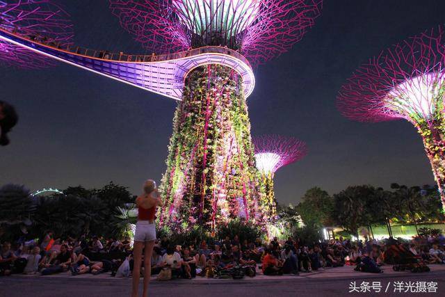 每天晚上,超级树都上演着梦幻的灯光秀,当夜幕开始降临,人们就从陆陆续续来到这里,席地而坐或躺在干净的广场地面上,等待表演的开始。