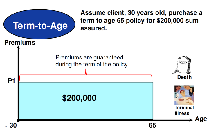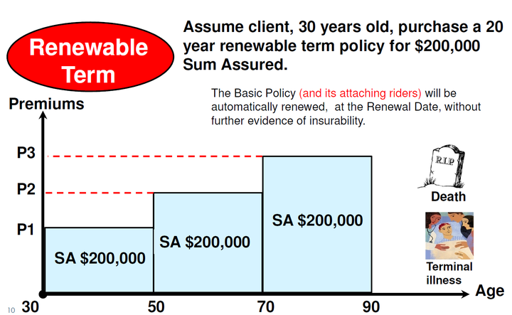 1. Term to Age 50, 55, 60, 65, 70, 75 & 99 - 保单可根据自身需求想法选择保障到50, 55, 60, 65, 70, 75 或99岁,年保费固定不变,保单到期终止。续签时候需要重新做身体检查,不保证可以续保, 还款年限可选择15年,20年或每年还款 (值得注意的是,如果选择的投保到99岁,就可以变相理解成遗产传承)