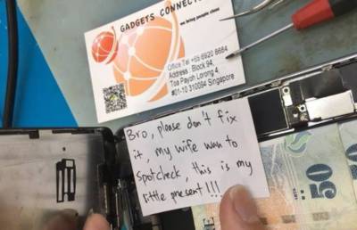 把手机送去维修,却要老板别把手机修好?大巴窑一家手机店就收到这样一个奇特的要求,有顾客将手机送修,老板打开手机壳后,竟发现里头藏有两张50元钞票,还有一张纸条,交代老板千万别把手机修好,因为“老婆要检查”!