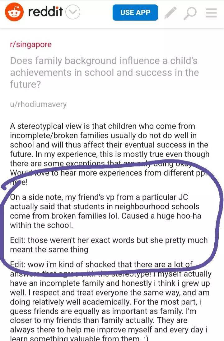 就这样说着说着…… 副校长曾德慧就冒出了一句:公教初级学院不像邻里学校,还说邻里学校大多数的学生都面对家庭问题(U all act like ur from a neighbourhood secondary school. Most of them behave this way because their families are in a mess)。