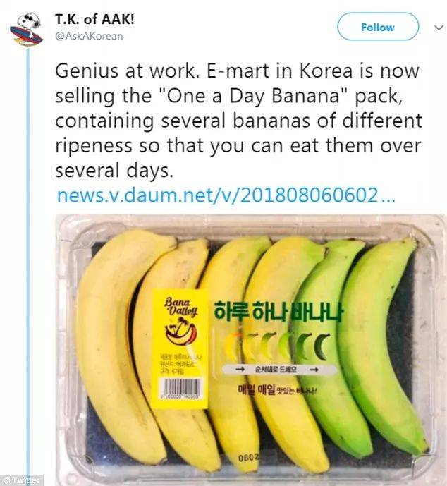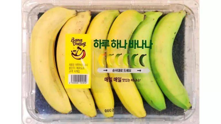 韩国的Emart超市就出奇招,将一串串香蕉拆分,再将不同熟度的香蕉重新包装在一起,解决消费者的这个烦恼。