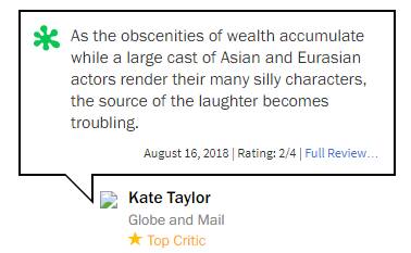 “《疯狂的亚洲富豪》不只是一部对于亚裔美国人来说超赞的好莱坞大片,同时也是一部晚了24年的电影。总之这是一部好电影。”