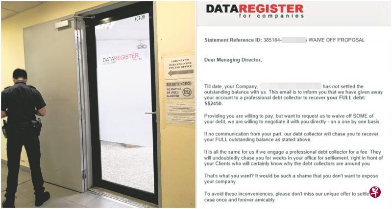 左图:早前有修车行老板收到讨债信后,前往Data Register位于乌美弯的办公室对质,惊动警员到场。(档案照) 右图:DataRegister在电邮中向用户称已聘请追债公司帮忙,并表示追债公司将“每周上门当着客户的面向你讨债”。(受访者提供)