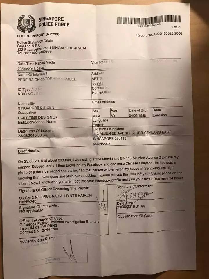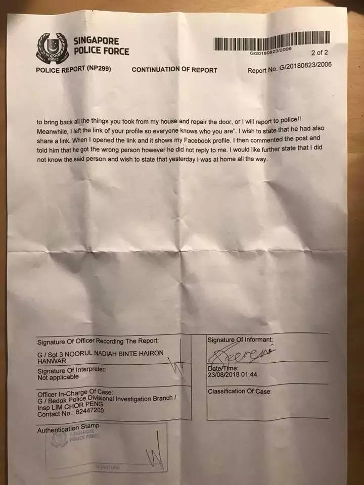 他竟然真的到芽笼邻里警局报了警,还附上了报警表格的照片。
