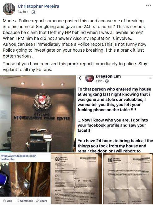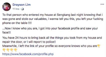 据了解,一名网友Drayson Lim在个人脸书页面上贴文,说有人到他位于盛港的住家偷东西,结果落下了手机,因而查到了关于小偷的个人资料。