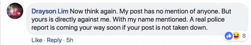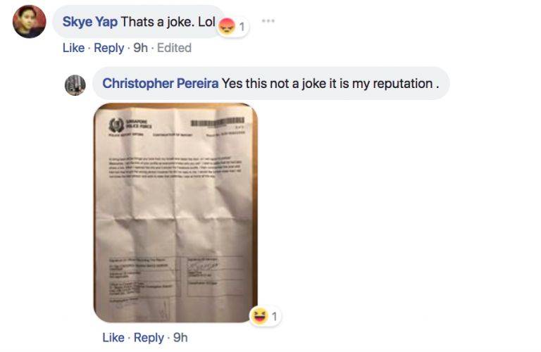另一名网友Christopher Perreira就信以为真,并留言表示他将报警处理。他甚至在个人脸书页面上发文说自己被他人污蔑。