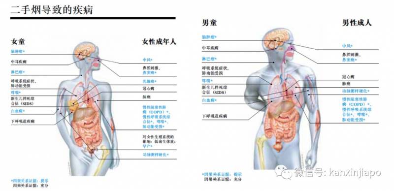 被动吸烟的烟雾可引起肺癌等恶性肿瘤、慢阻肺、心、脑血管病等严重疾病,使非吸烟者的冠心病风险增加25%~30%,肺癌风险提高20%~30%。下面来看一下疾控中心显示的吸二手烟可能造成的疾病。