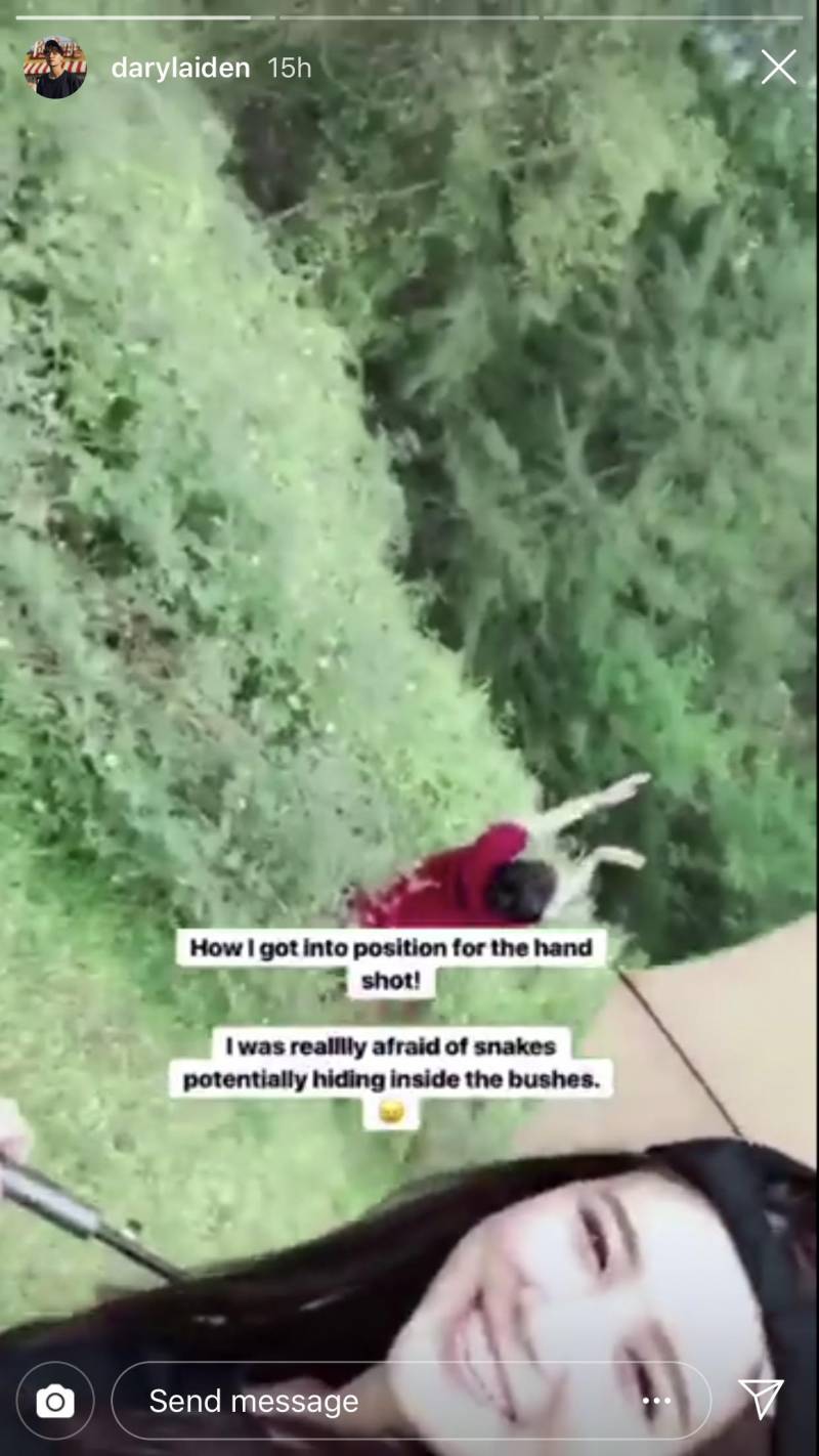 他也分享了拍摄过程,包括自己怎么在草丛中摆出照片中所见的手势。他还说,自己很害怕可能藏在草丛中的蛇。(截图:Instagram/ darylaiden)