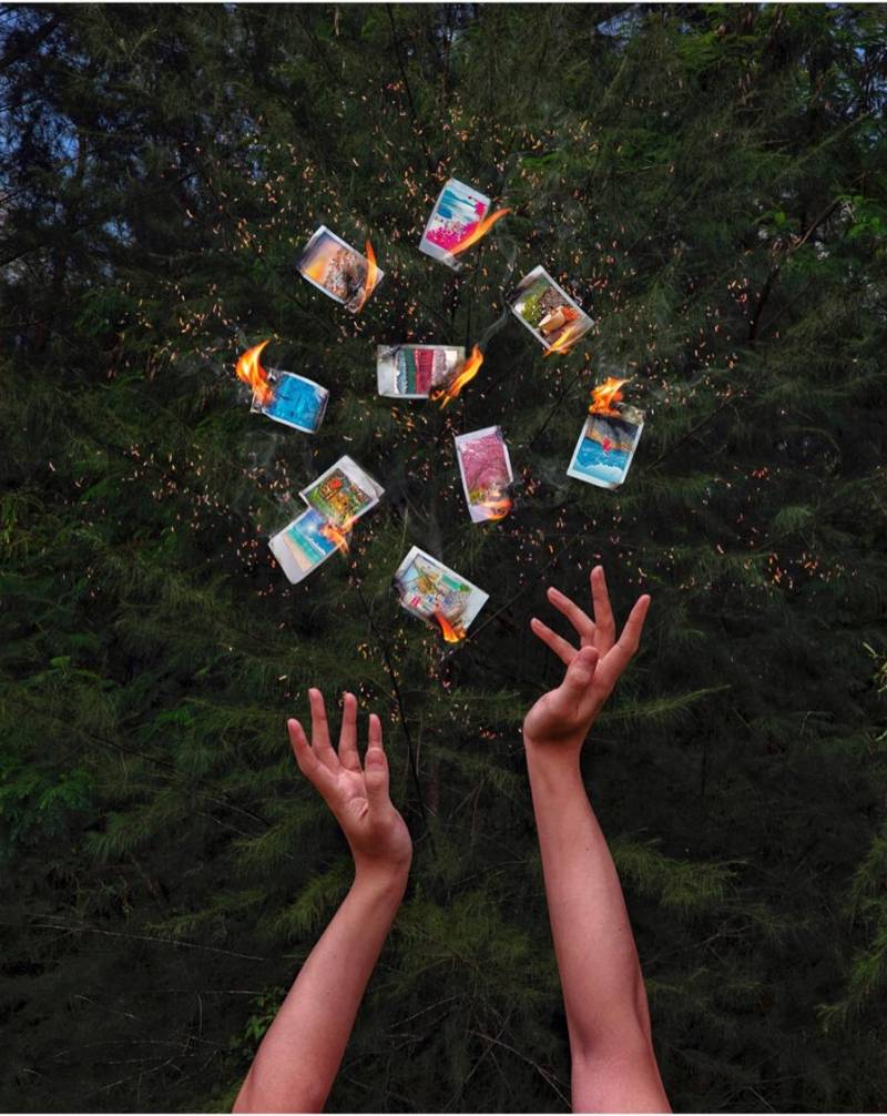 Daryl Aiden Yow先把Polaroid照片一一点燃,再把个别照片通过修图软件合成起来。