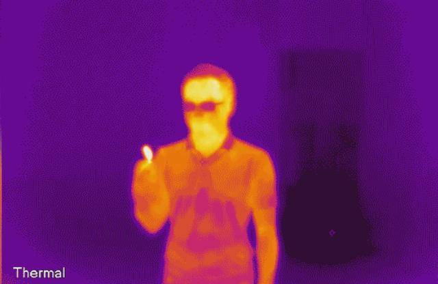 原理是很简单的,一旦气温出现变化,以这个例子而言就是有人点烟,热成像摄像机就会突出有烟的点,放大并捕捉那个点。