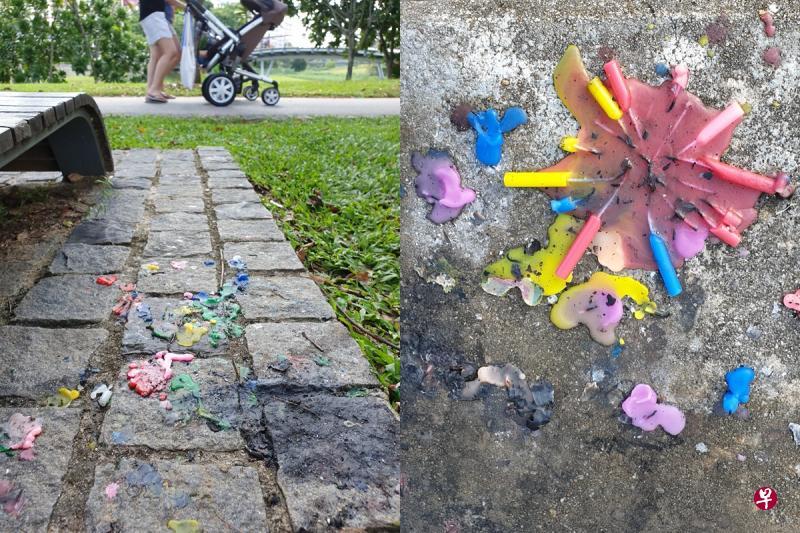 庆祝活动结束后,公园里留下不少五颜六色的“蜡烛残泪”。(梁麒麟 摄)