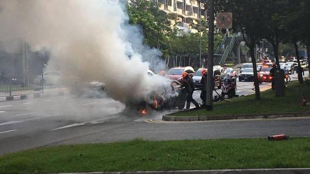 网民向All Singapore Stuff的Facebook页面提供的照片显示,里峇峇利路今早在一辆轿车在路边着火,数名民防部队人员在现场救火。