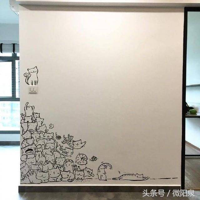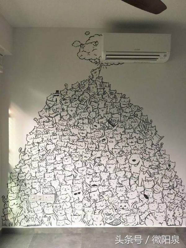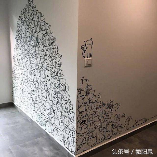 厉害了我的姐!新加坡一位设计师为一对新婚夫妇的新家画了一面猫墙,她花了6个小时完成这堵墙,还在猫群中画了两只狗,好可爱的创意,不过那两只狗好像被淹没在猫咪里了~