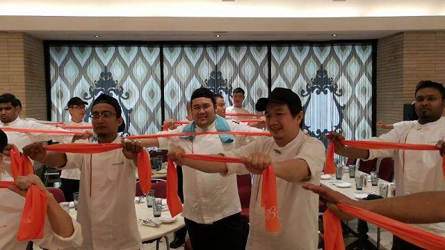 广告史各士皇族酒店的员工在酒店餐厅,跟着指导员做伸展运动。员工们趁著短短的休息时间,积极的做运动。洗衣部员工、61岁的谢秋凤,学会伸展运动后,身体健康改善了不少。