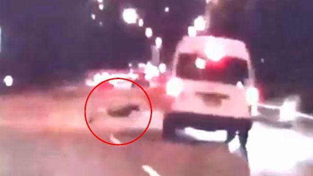 视频显示,小型货车司机似乎闪避不及,迎头撞上路人。路人身体着地,接连翻滚几圈,躺倒在车道上。