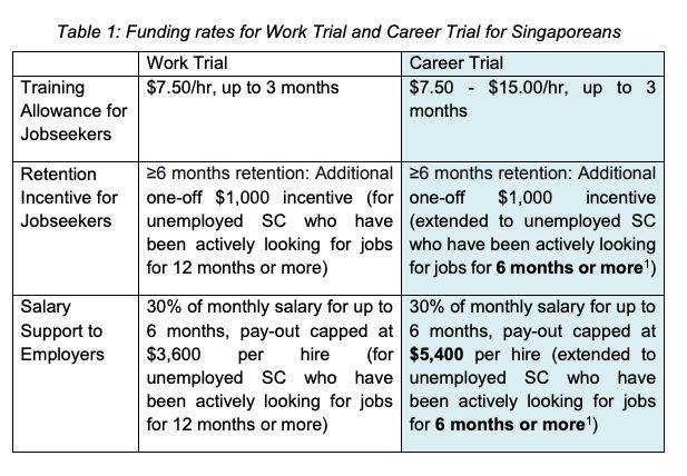 新加坡雇主可以通过短期工作试验评估求职者的工作适合性,在试用期后,雇主向合适的新加坡公民雇员支付每月1,500新币或更多的薪水。