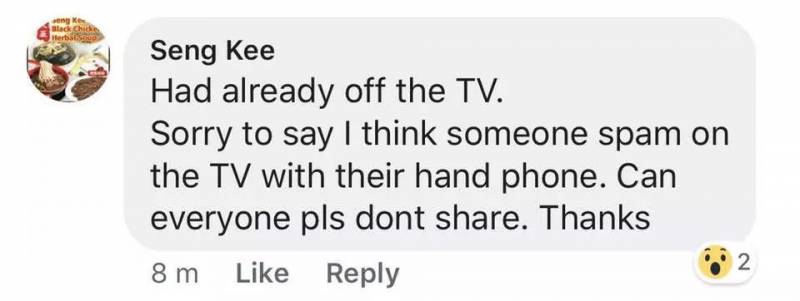 成基餐馆的人员Seng Kee也在贴文下留言,表示已经把电视关掉,也解释说这有可能是顾客恶作剧,并呼吁网友不要再转发贴文。